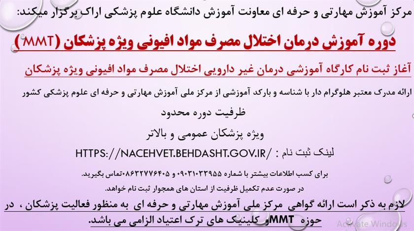 به اطلاع می رساند مرکز آموزش مهارتی و حرفه ای دانشگاه علوم پزشکی اراک در نظر دارد، دوره آموزشی و مهارتی  "درمان اختلال مصرف موداد افیونی ویژه پزشکان" را برگزار نماید.